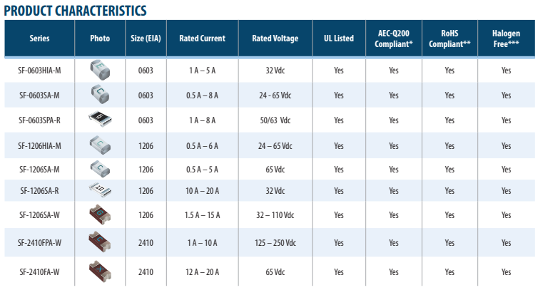 SF-1206SA-R、SF-120 6SA-W、SF-2410FPA-W、,SF-2410FA-W型號系列為UL248-14列出,符合RoHS和無鹵素。