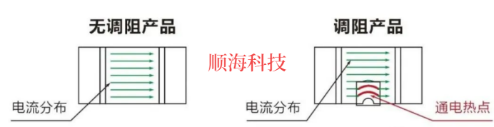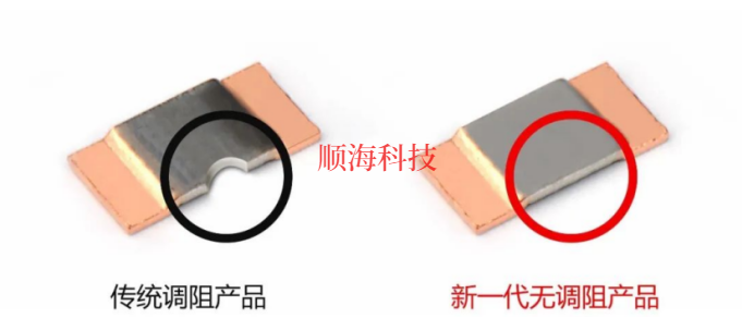 調(diào)阻是絕大多數(shù)的電阻制造中必不可少的環(huán)節(jié),比如廣泛應用的厚膜電阻和薄膜電阻。調(diào)阻能使電阻的阻值精度達到公差允許范圍內(nèi),但也會帶來一些潛在的風險,比如額定能量的損失,熱聚集等。尤其是需要承擔較大電流的純合金電阻,在調(diào)阻缺口處電流聚集,形成熱點,這對于電阻的長期可靠性非常不利。
