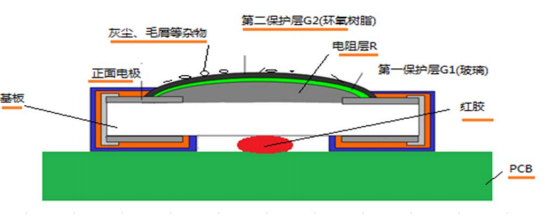 2、電阻的阻值是在電極兩端測(cè)得的值。測(cè)量值由多種因素組成。如內(nèi)阻本身的電極、電阻層、保護(hù)層等。在使用過程中,也會(huì)影響并聯(lián)電阻,形成最終電阻值,如:外焊錫和PCB板焊接處的紅膠,使用過程中環(huán)境產(chǎn)生的灰塵和切屑,以及濕氣對(duì)PCB板的影響。電阻器的表面保護(hù)層等因素。如圖二所示: