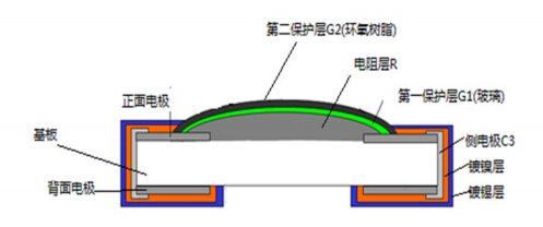 4、G1和G2都是保護(hù)層,G1是玻璃保護(hù),燒結(jié)溫度600℃,G2是樹脂層,固化溫度200℃左右。兩層共同作為絕緣層,保護(hù)電阻R層,防止外界損傷有害物質(zhì)直接浸入R表面,對(duì)R有害。當(dāng)保護(hù)層受潮時(shí),會(huì)產(chǎn)生一定的電阻值, 約 50MΩ左右,并聯(lián)在R的兩邊,對(duì)R的值會(huì)有一定的影響。