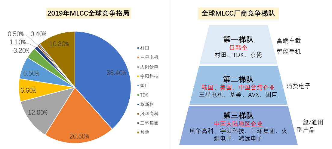 以片式多層陶瓷電容器市場為例,日本企業(yè)的整體市場份額最高達(dá)到56%;中國大陸的片式多層陶瓷電容器生產(chǎn)廠商只占世界總量的6%左右。從片式多層陶瓷電容器制造商競爭趨勢來看,日本企業(yè)(村田、TDK和京瓷)具有強(qiáng)大的優(yōu)勢處于世界第一梯隊(duì);美國、韓國和中國臺灣的企業(yè)(三星汽車、凱美特、AVX和國家巨人)處于第二梯隊(duì)。中國大陸企業(yè)風(fēng)華高科技、裕洋科技、三環(huán)集團(tuán)、火炬電子和宏源電子位于第三層。日本制造商憑借自身的技術(shù)優(yōu)勢,生產(chǎn)出體積小、電容值高的產(chǎn)品,占領(lǐng)了MLCC高端市場;大陸廠商主要生產(chǎn)大中型低電容MLCC產(chǎn)品。